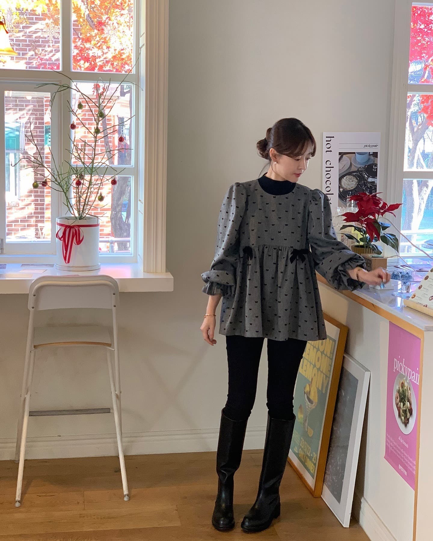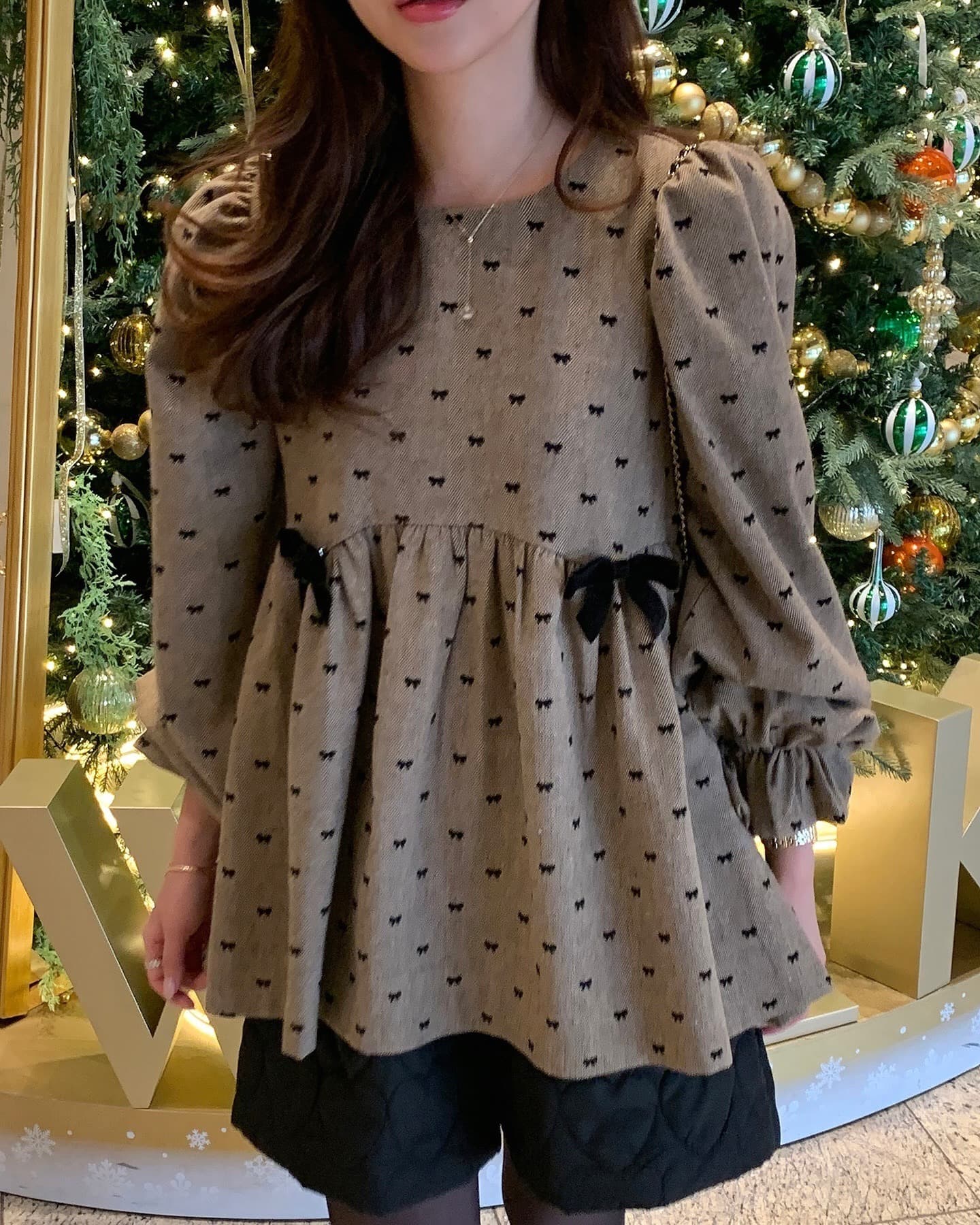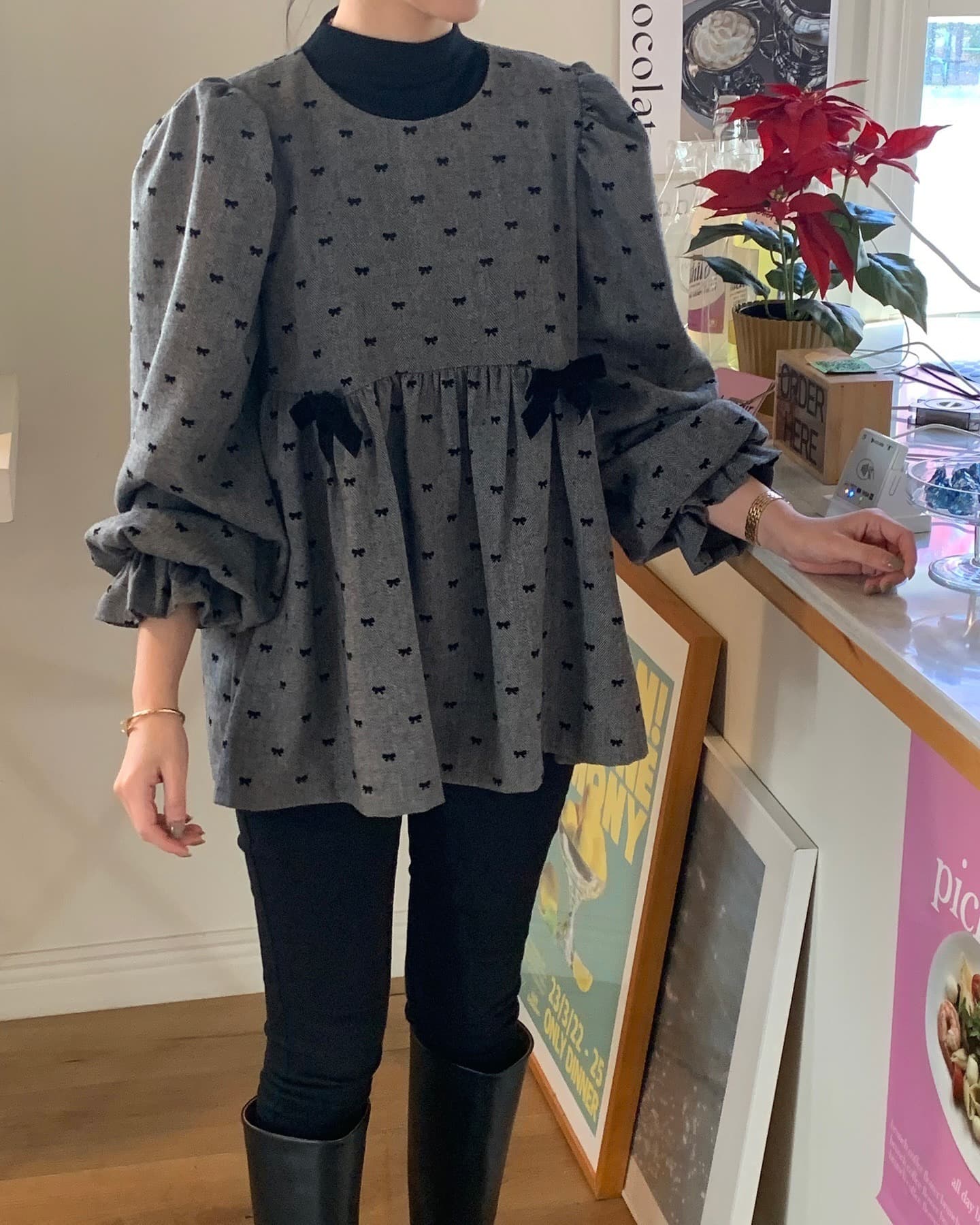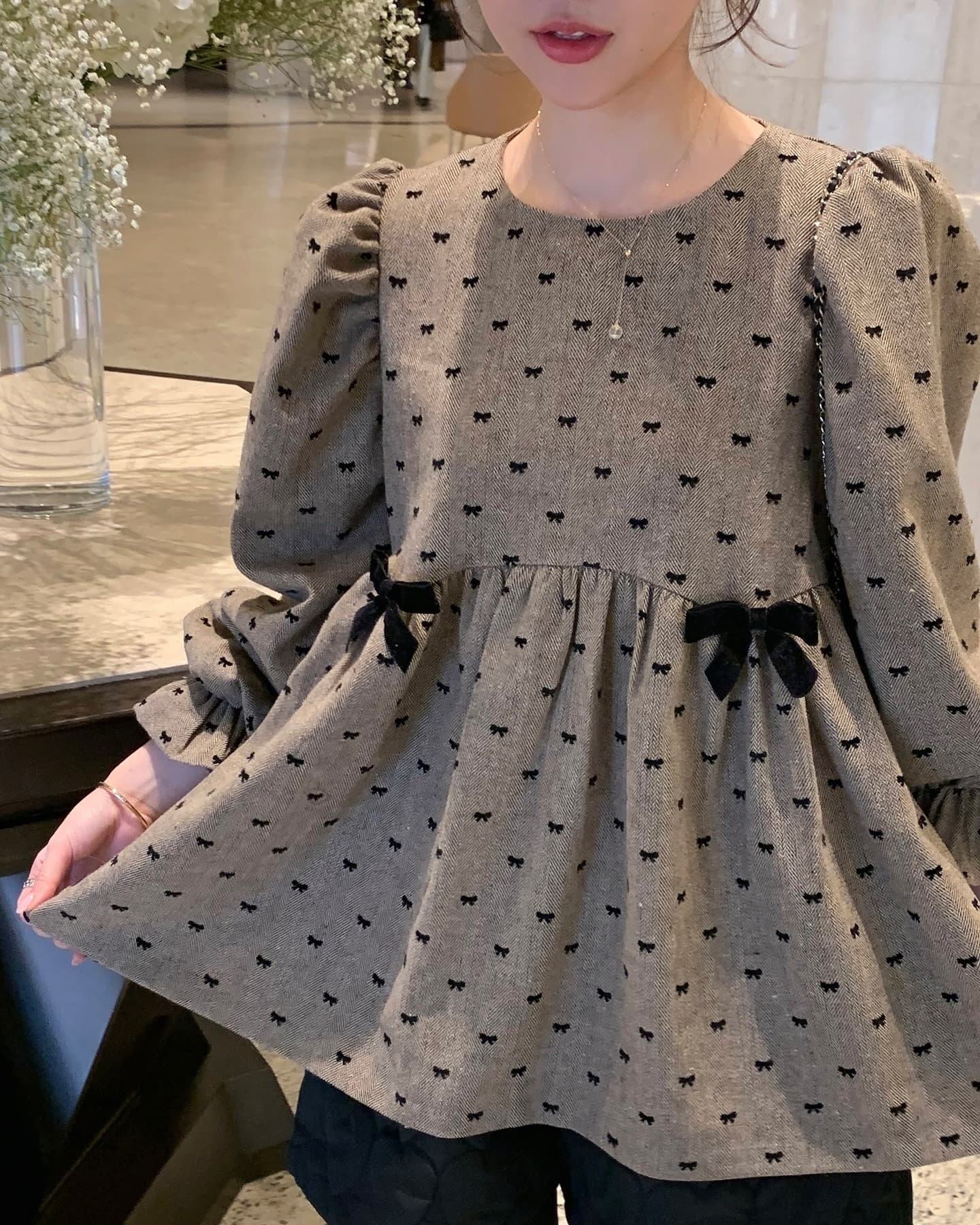 可愛いリボン柄が散りばめられたフレンチガーリースタイルのブラウス。