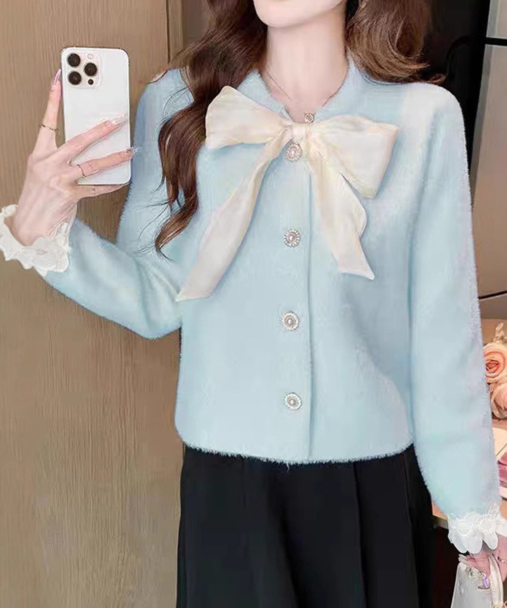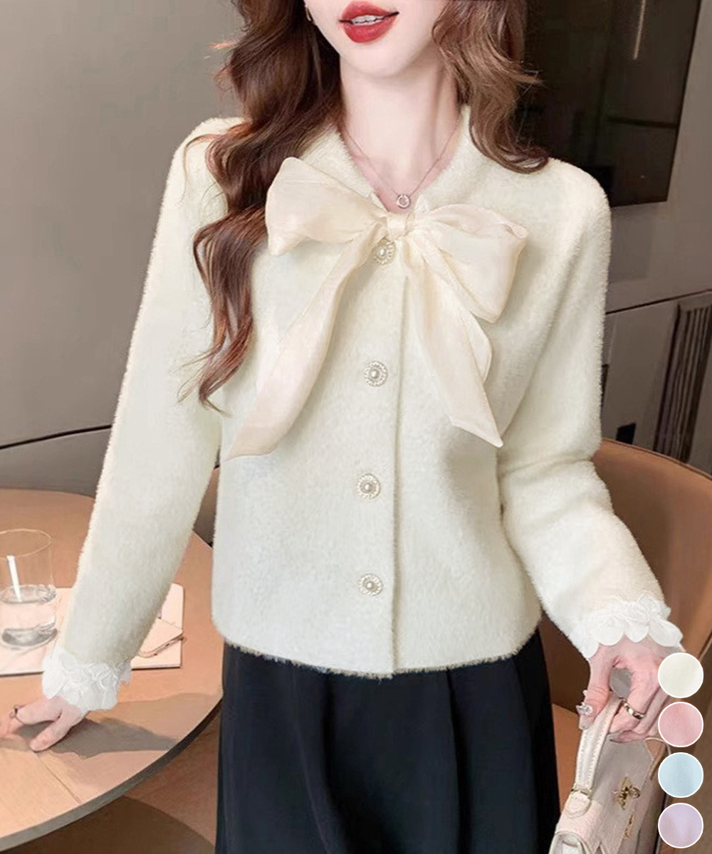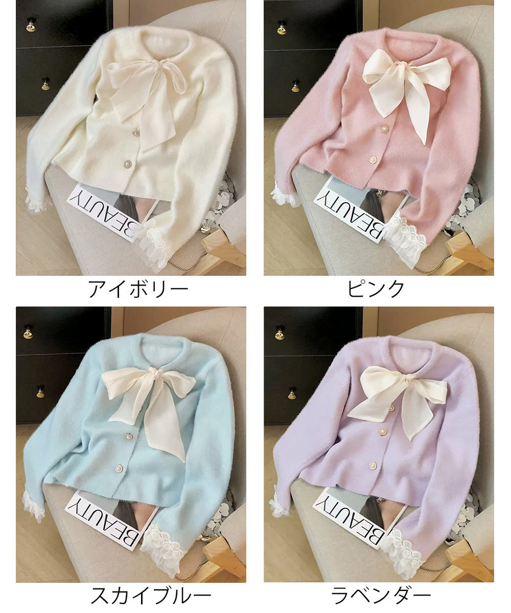 大人可愛いニットセーター 袖レース レディース オフィスカジュアル ビッグリボンニットカーディガン パール調ボタン韓国風 デート服 お呼ばれ フェミニンニット秋 あったかニット上品 大きめリボンタイが目を惹くフェミニンニット。 シャギー調素材で柔らかく、優しい肌ざわり。 フロントのパール調ボタンで上品さと華やかさをプラス。 袖口のさりげないレースが女性らしさを演出。 デートや通勤、入学・卒業式など、さまざまなシーンで活躍。 素材:ポリエステル75%+アクリル25% カラー:アイボリー/ピンク/スカイブルー/ラベンダー サイズ:ワンサイズ 着丈:約55cm 肩幅:約40cm 袖丈:約62cm ゆき:約82cm 身幅:約52cm 胸囲:約104-130cm 裏地:なし 伸縮性:あり 透け感:なし 生産国:中国 ※すべて平置きサイズです(採寸方法違いより、多少の誤差がございますので、ご了承ください)。 ※海外輸入品のため、商品の細部仕様は多少異なる場合がございます。予めご了承の上、ご注文お願い致します。