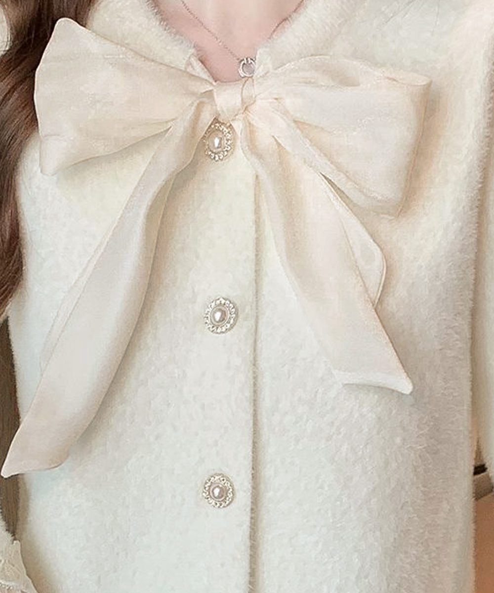 大きめリボンタイとパール調ボタンが上品な華やかさを演出します。