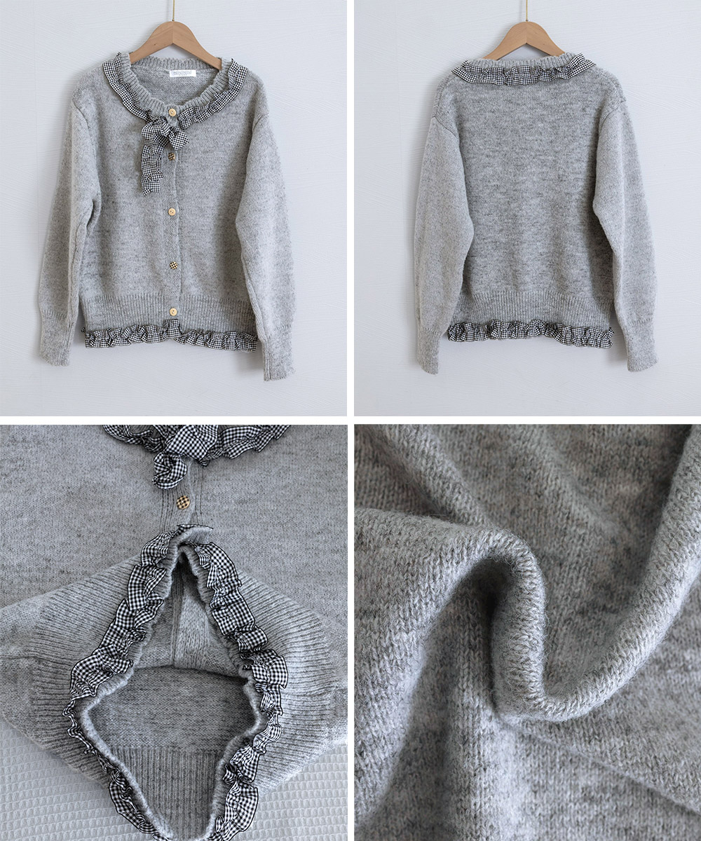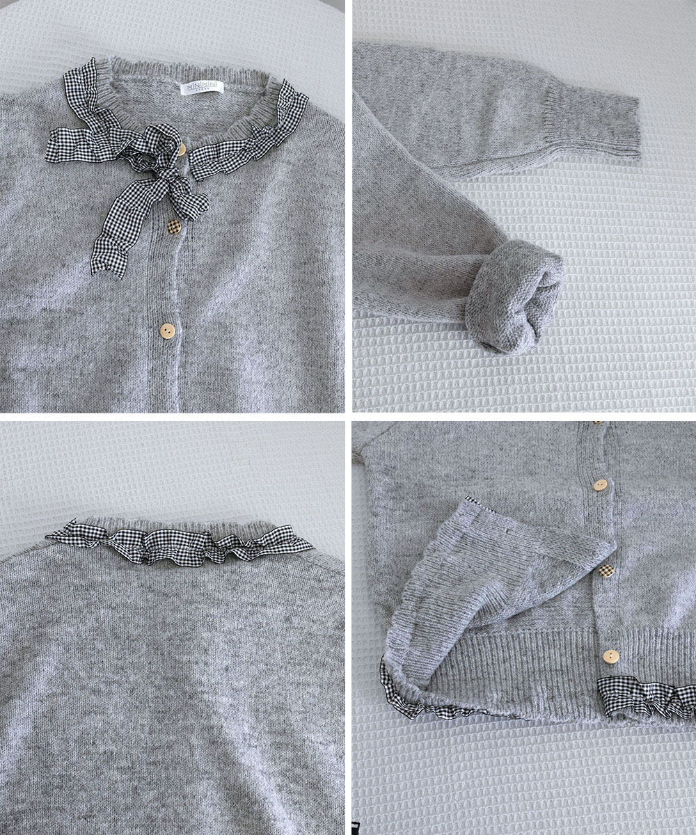 襟元のギンガムチェックリボンと裾のフリルが可愛らしさを演出し、コンパクトな丈感でバランス良く着こなせます。