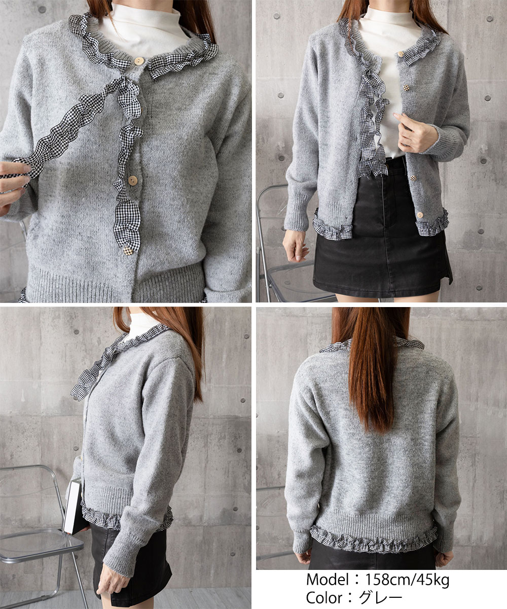 レディースギンガムチェックリボン 切り替えニットトップス きれいめフリル裾カーディガン おしゃれ 大人可愛いニット韓国風 コンパクトニット春 クルーネックニット ニット羽織長袖無地 ガーリーテイストの異素材フリルに、ギンガムチェックのリボンを添えたラウンドネックニットカーディガン。 コンパクトな丈感でバランスが取りやすく、スカートにもパンツにも合わせやすい。 リボンとフリルが顔まわりを華やかに見せ、1枚で着映えるデザイン。 デイリーのカジュアルからフェミニンスタイルまで幅広く活躍し、1枚で華やぐ主役アイテム。 素材:ポリエステル75%+アクリル25% カラー:アイボリー/グレー サイズ:ワンサイズ 着丈:約57cm 肩幅:約42cm 袖丈:約55cm ゆき:約76cm 身幅:約52cm 胸囲:約104-130cm 裏地:なし 伸縮性:あり 透け感:なし 生産国:中国 ※すべて平置きサイズです(採寸方法違いより、多少の誤差がございますので、ご了承ください)。 ※海外輸入品のため、商品の細部仕様は多少異なる場合がございます。予めご了承の上、ご注文お願い致します。