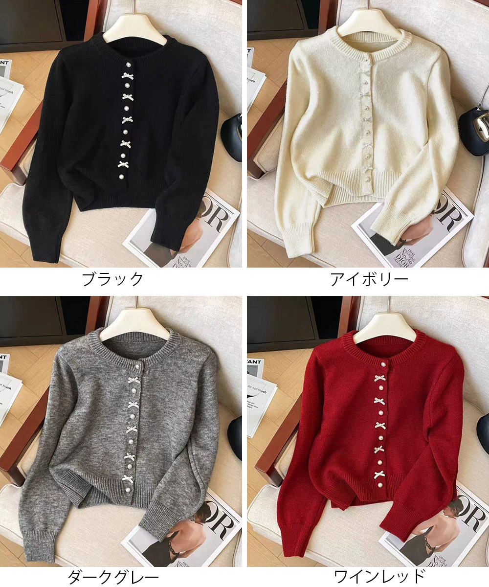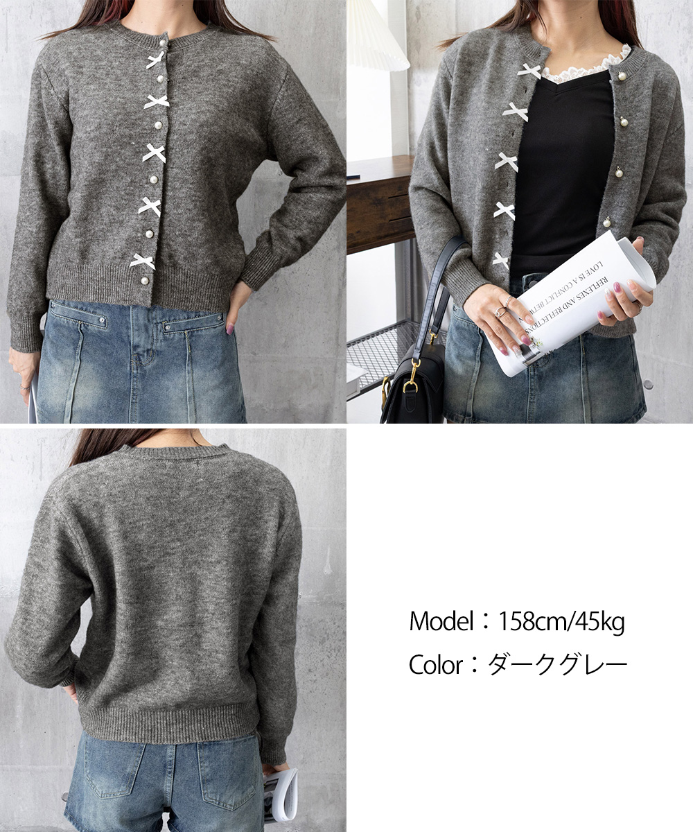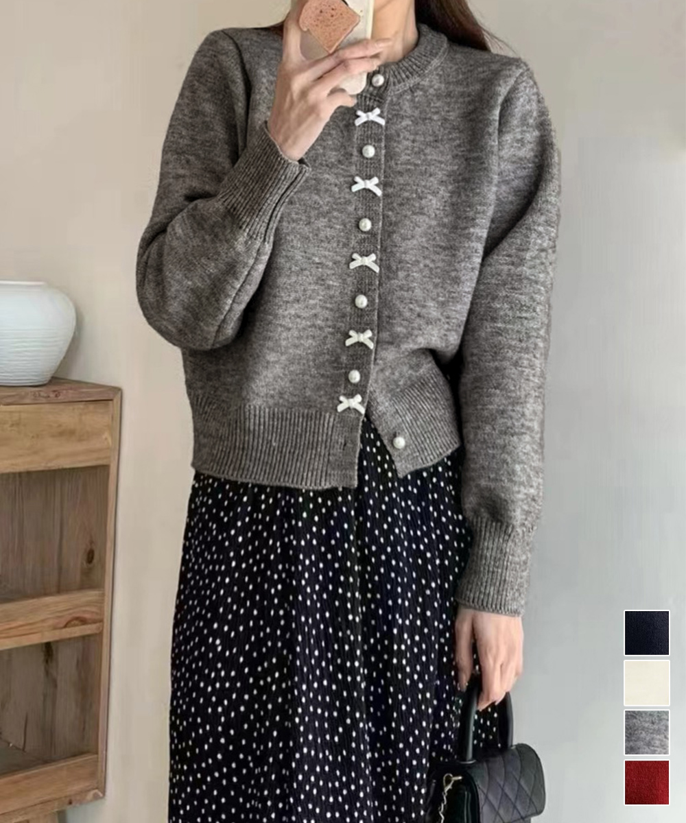 白いリボンとパールボタンが可愛らしいフレンチガーリーなニットカーディガン。
