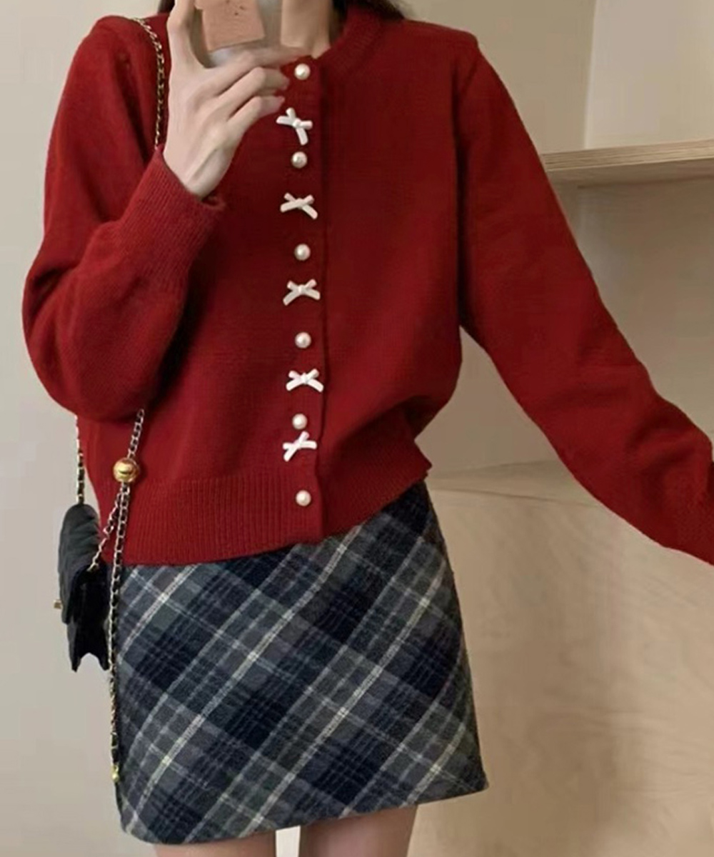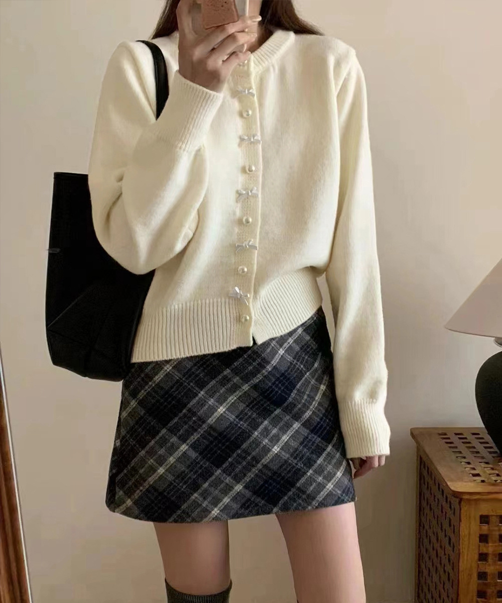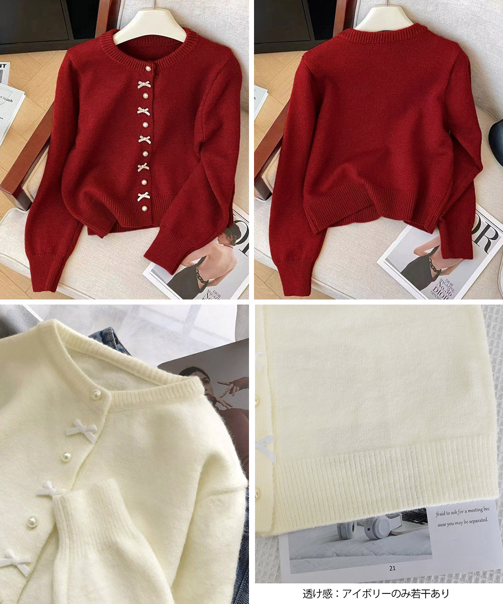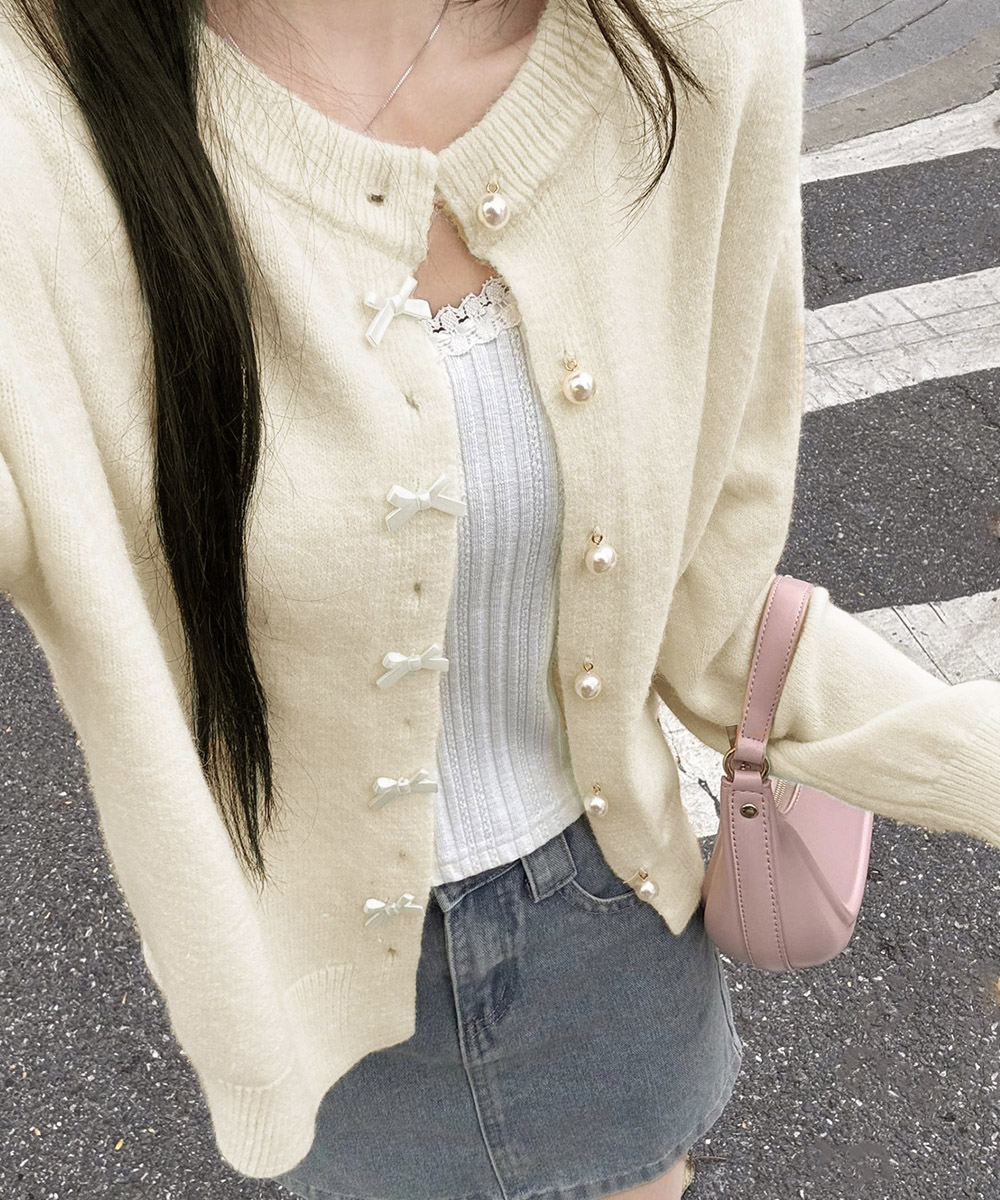 白いリボンとパールボタンが可愛らしいフレンチガーリーなニットカーディガン。