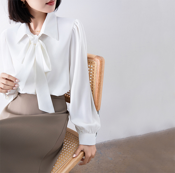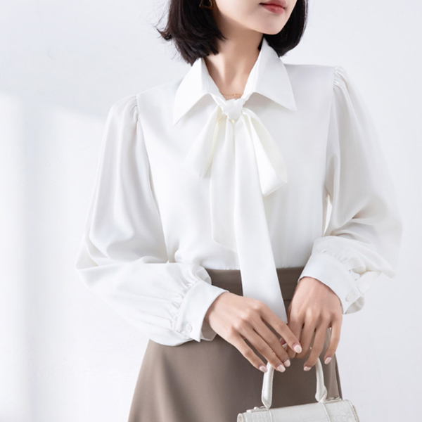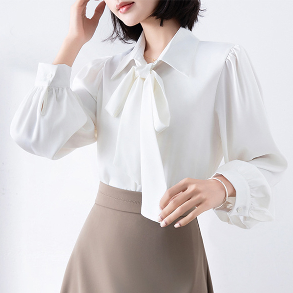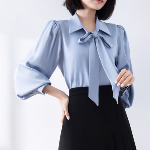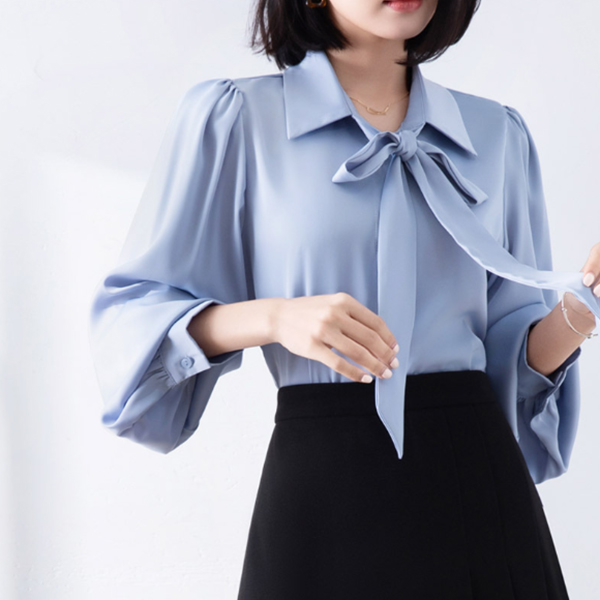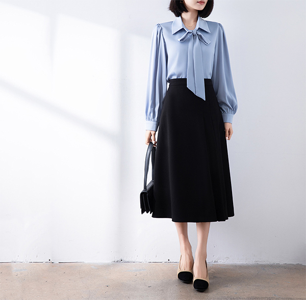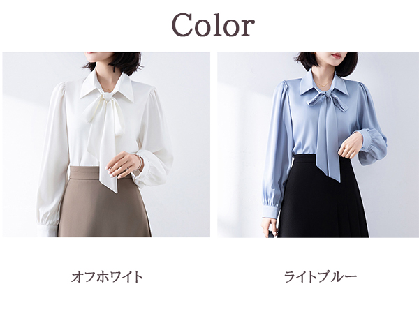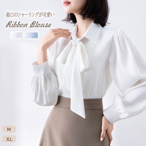首元のリボンが女性らしさを演出し、きれいめコーディネートの主役になるアイテムです。