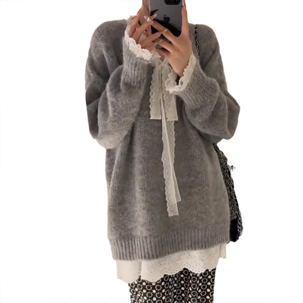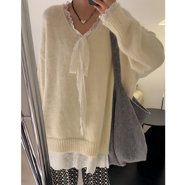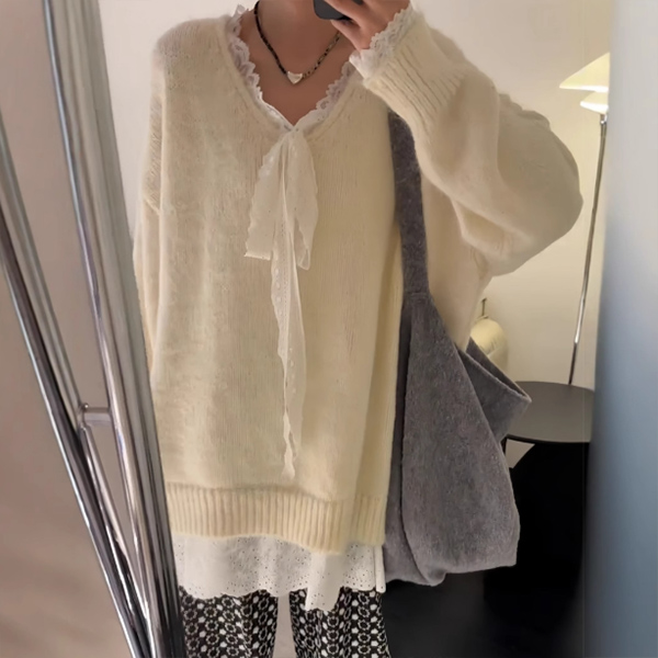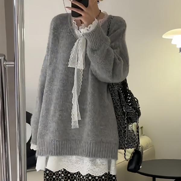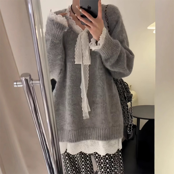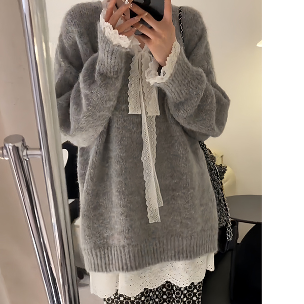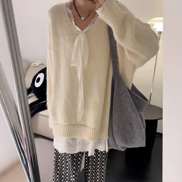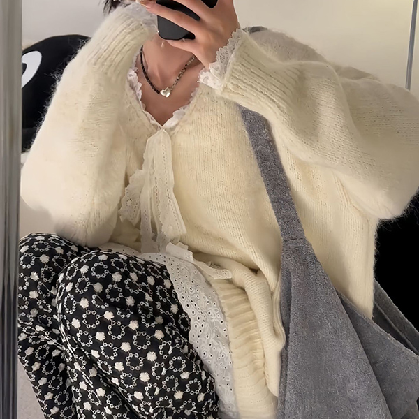 胸元の繊細なレースリボンが女性らしさを演出し、ゆったりとしたシルエットで着心地も抜群。