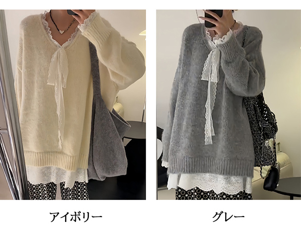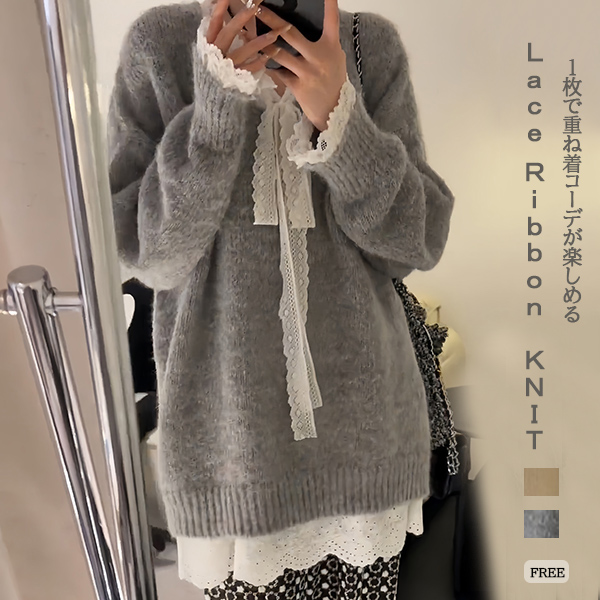 ■コメント ・1枚で重ね着コーデが楽しめるレースリボンニットトップスです。 ・ネック周りのスカラップレースが顔周りを華やかに魅せてくれます。 ・ゆったり着られるのにキレイ見えするオーバーサイズ感。 ・ヒップまで隠れる長めの丈感と、ドロップショルダーのゆったりシルエットで体型カバーも叶います。 ■サイズ(単位:約cm) フリーサイズ 着丈約72 バスト約115 袖丈約63 ※平置き採寸の為、1-3cmの誤差がある場合があります。予めご了承下さいませ。 ■カラー 画像に記載 ■裏地 なし ■生地の厚さ 普通 ■透け感 なし ■伸縮性 なし ■素材 アクリル60%、ポリエステル40%