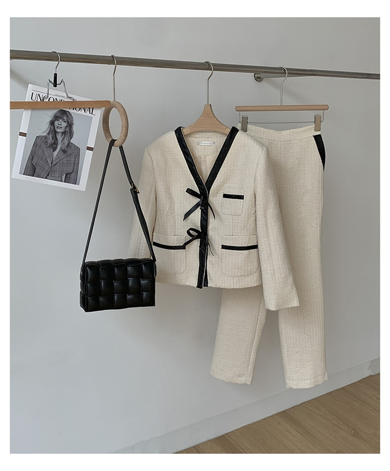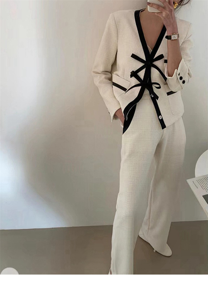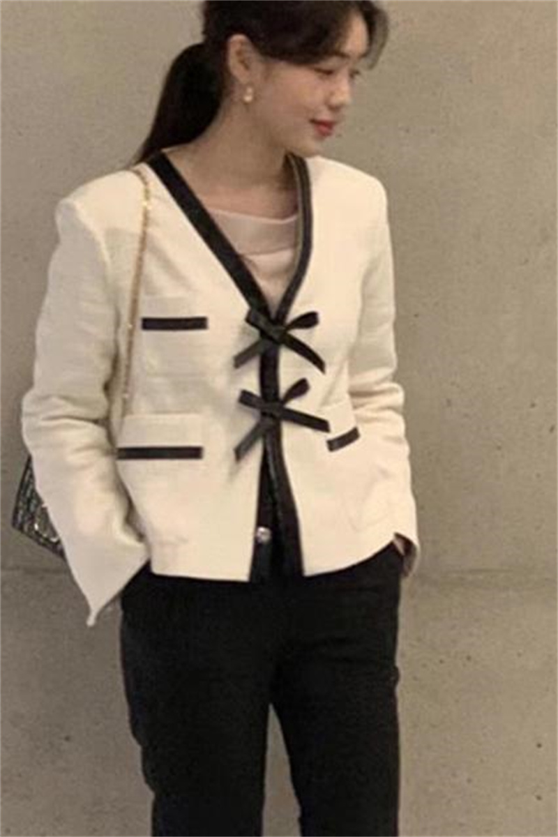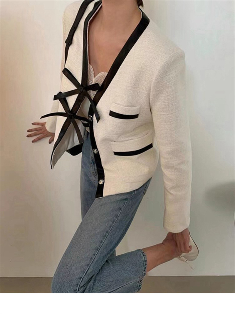 白地に黒のパイピングとリボンディテールが上品さを演出します。