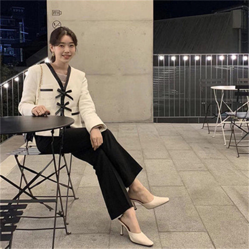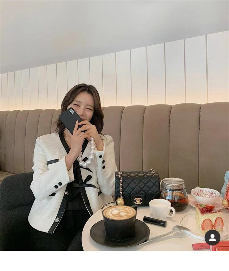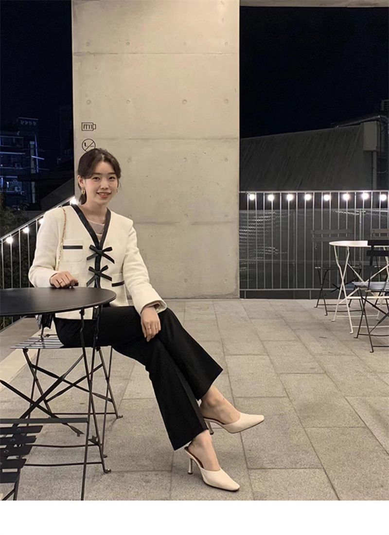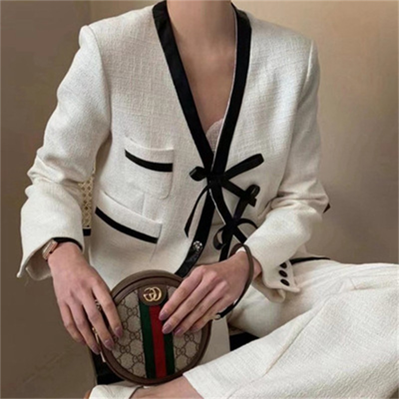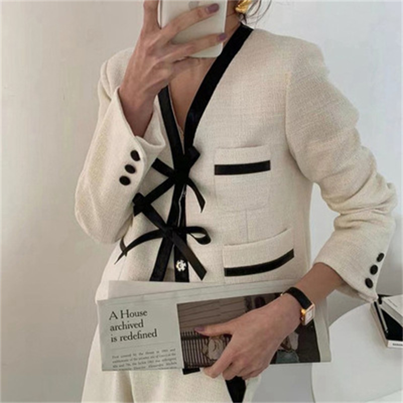 白地に黒のパイピングとリボンディテールが上品さを演出します。