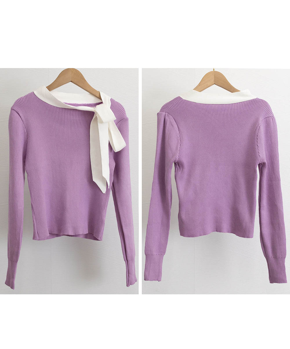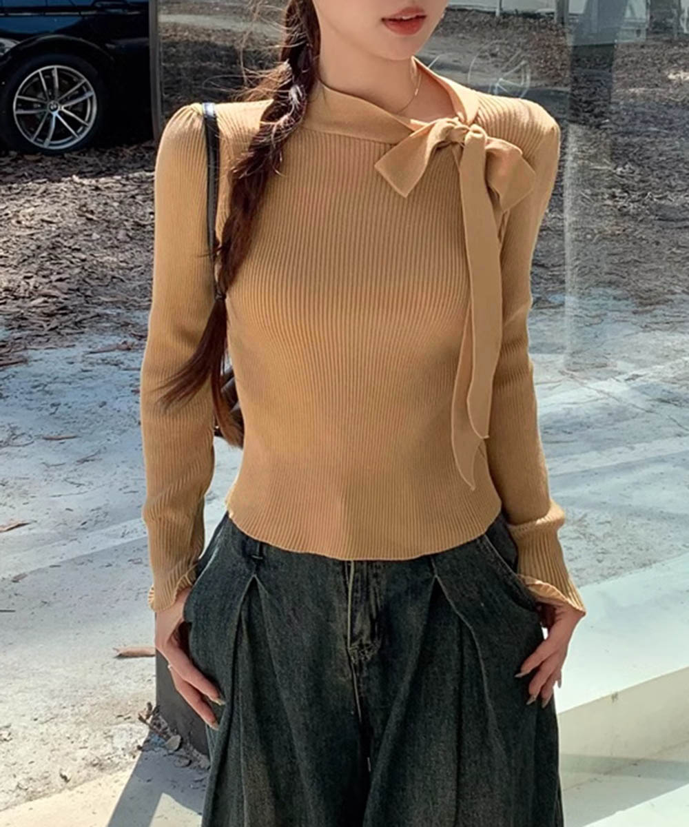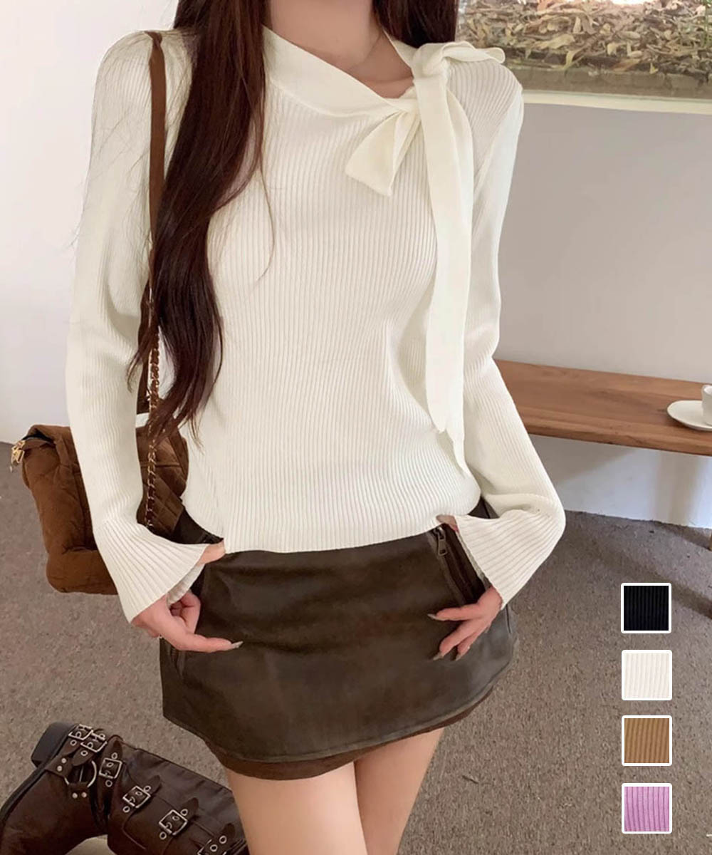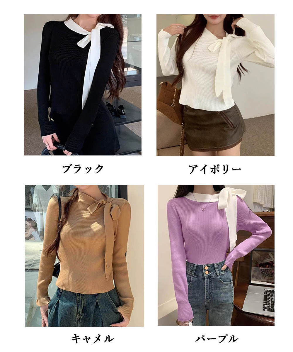 フレンチガーリーな魅力を引き立てる、上品なリボンネックが印象的なリブニットトップスです。