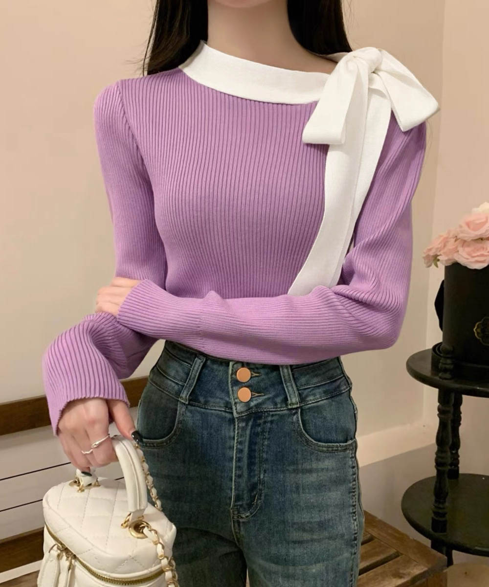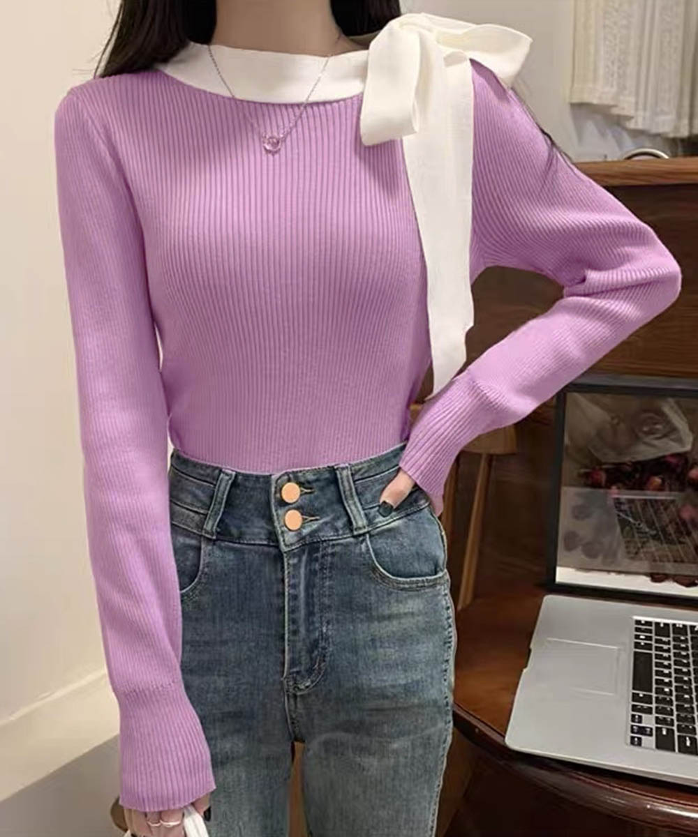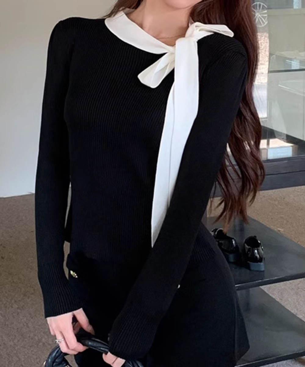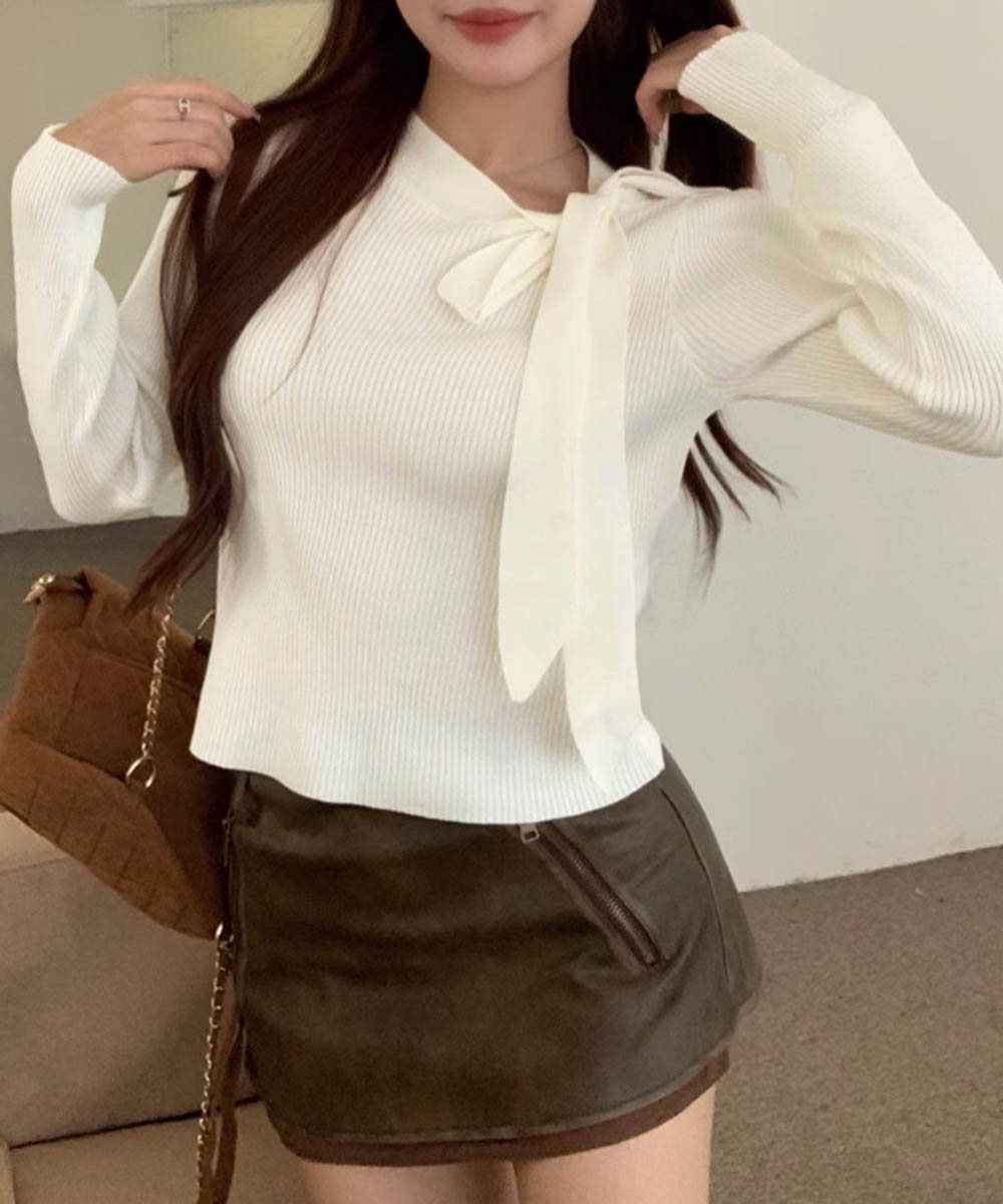 フレンチガーリーな魅力を引き立てる、上品なリボンネックが印象的なリブニットトップスです。