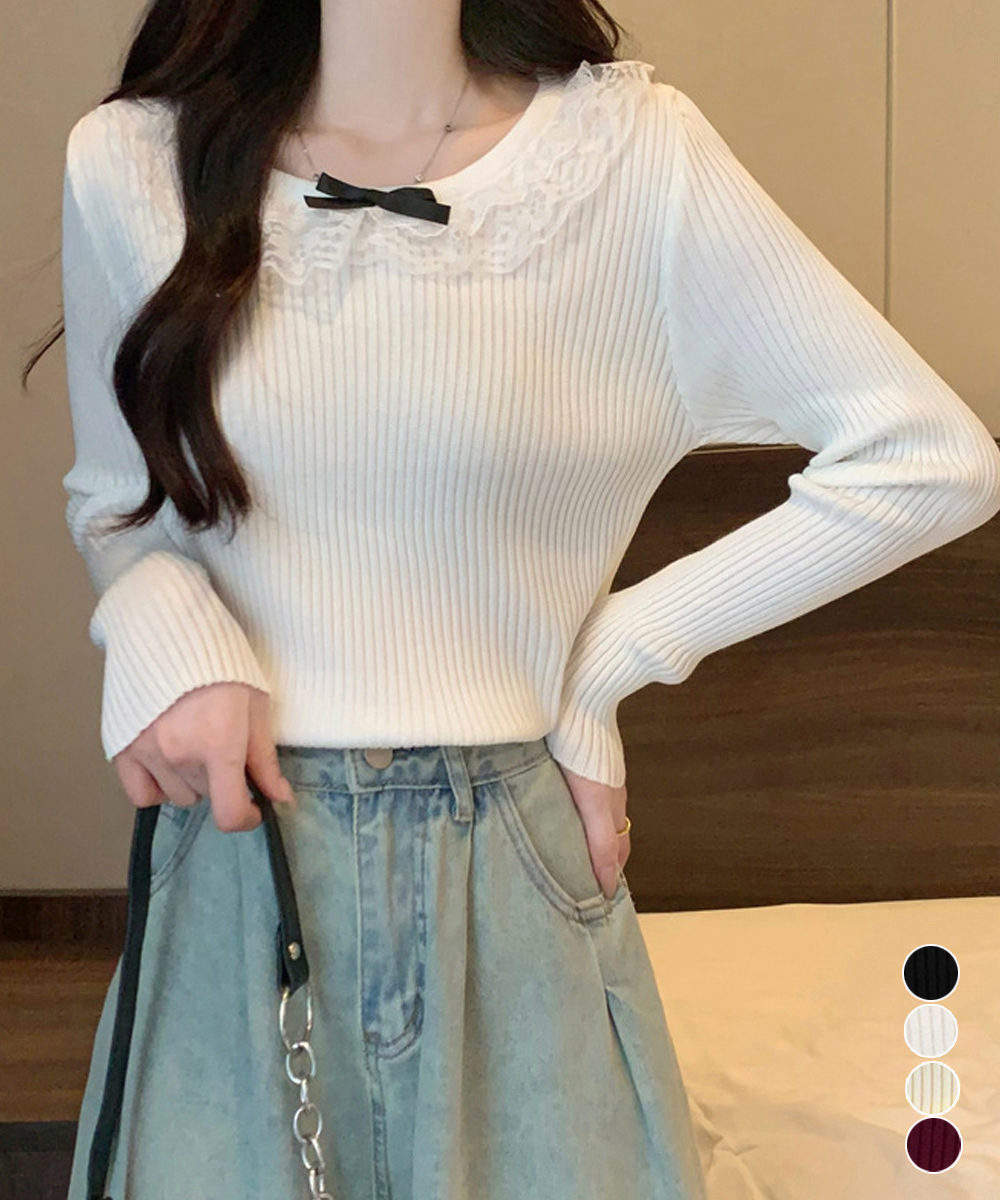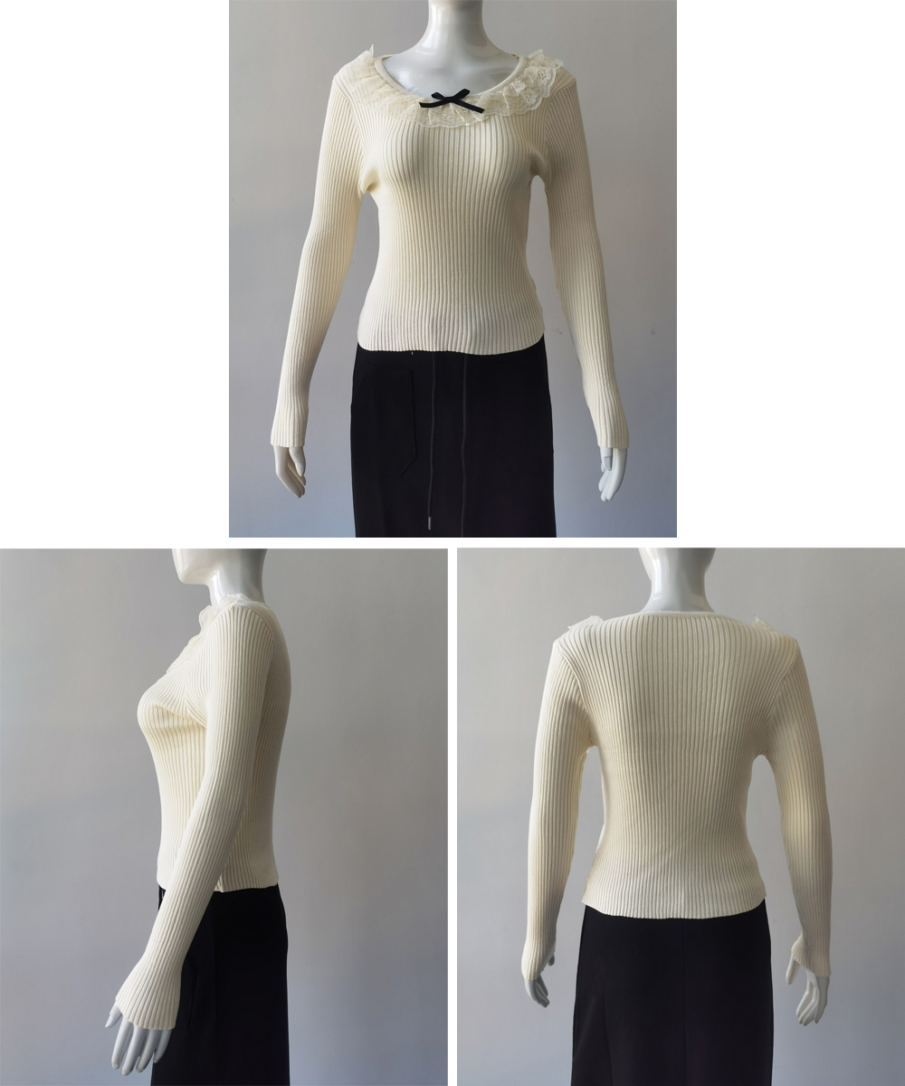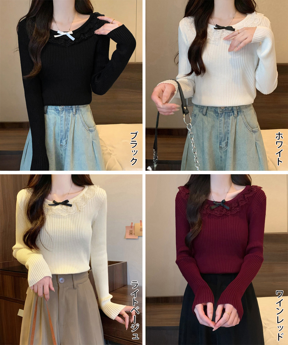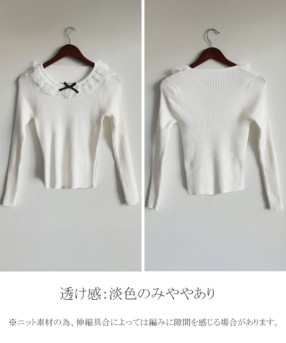 襟元にあしらわれたレースとリボンが、フレンチガーリーな雰囲気を演出します。