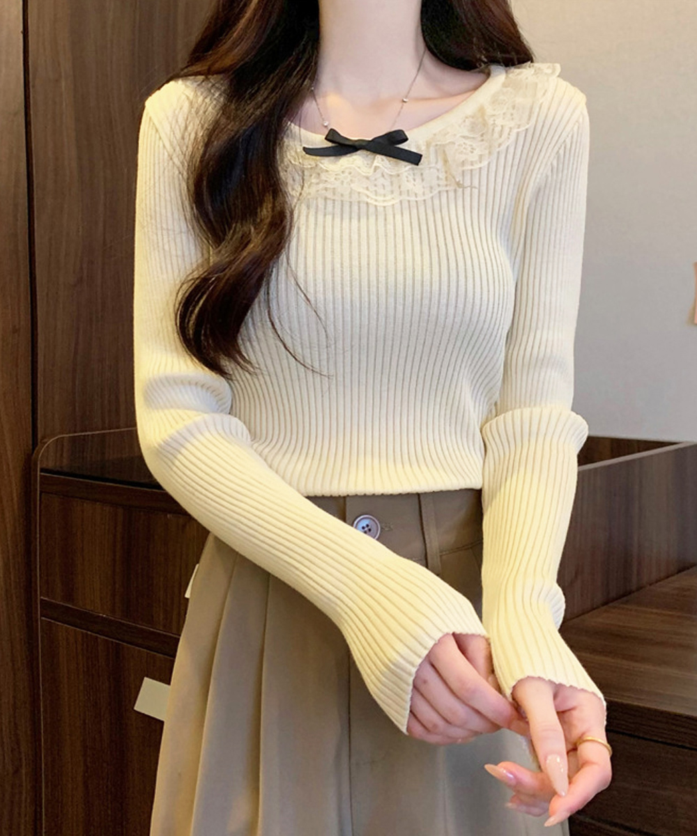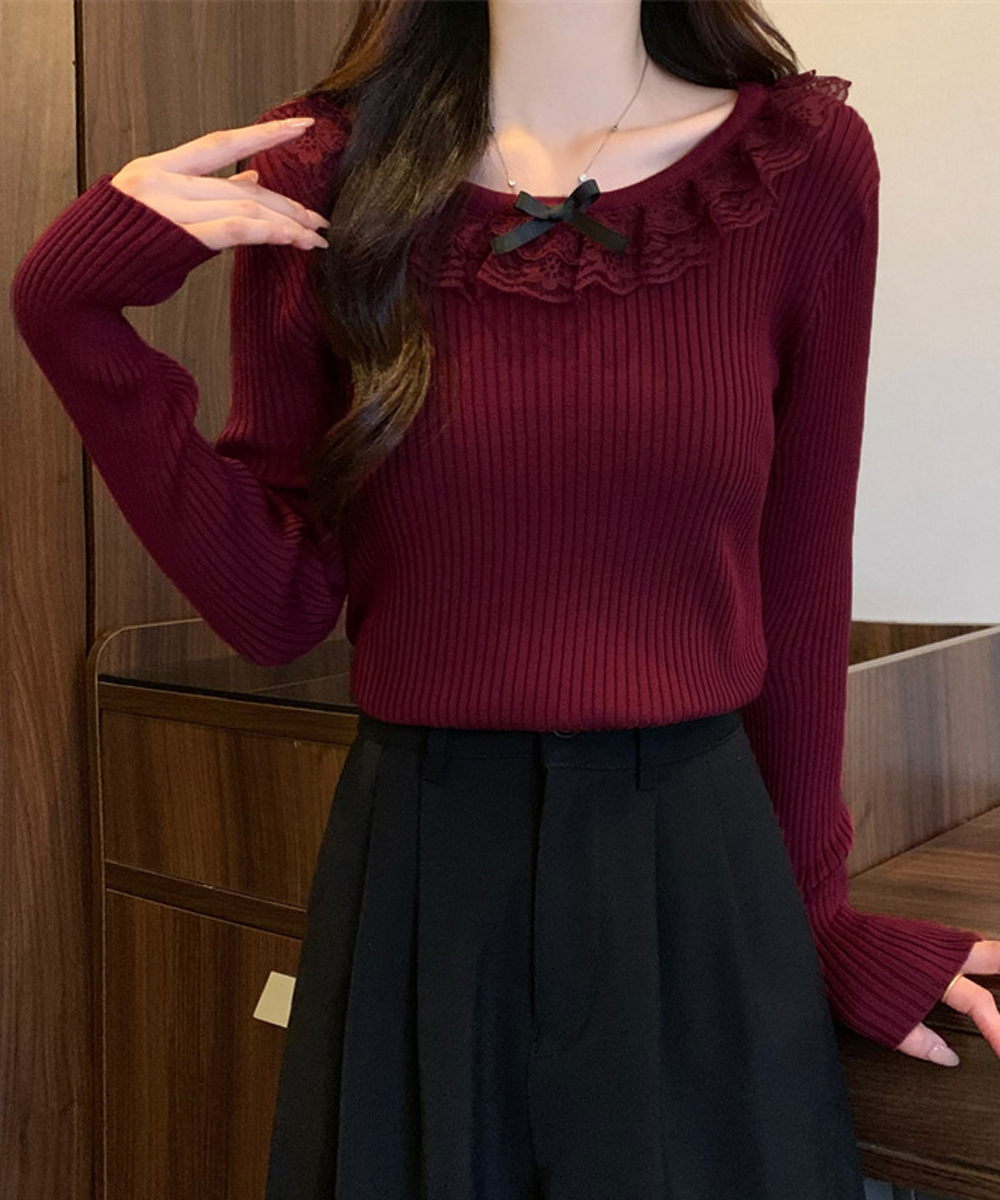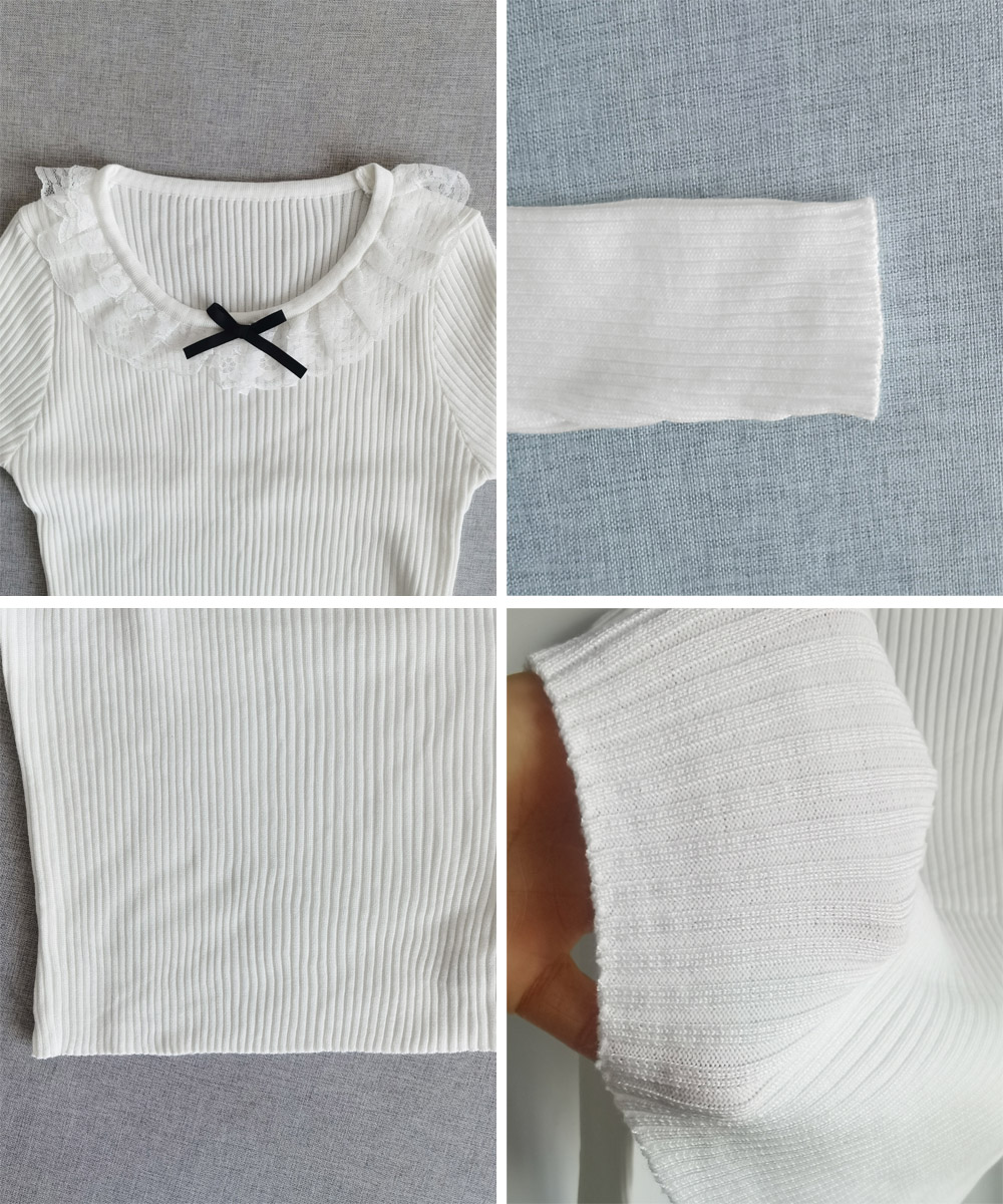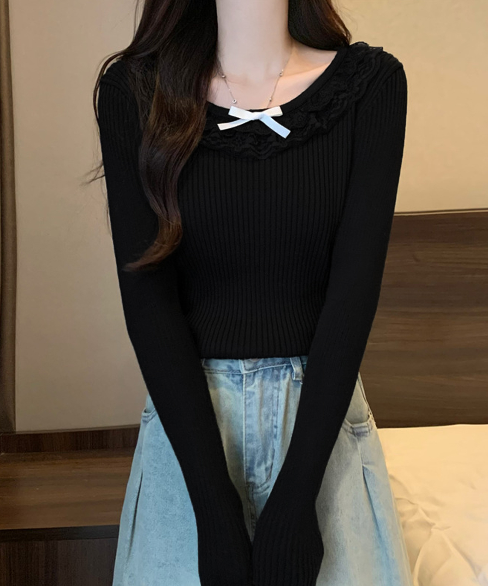 襟元にあしらわれたレースとリボンが、フレンチガーリーな雰囲気を演出します。